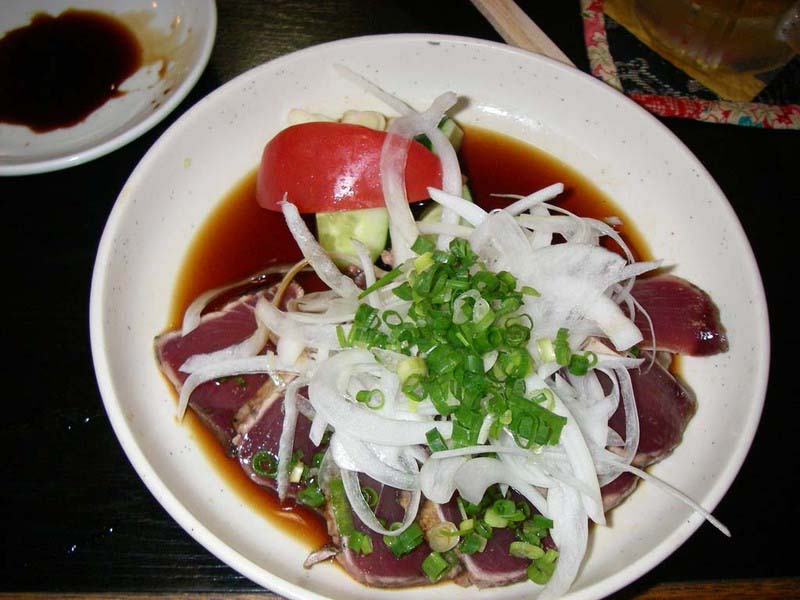 「カツオのたたき」です.見た目に特に違いは感じられません.しかし食べてみると、「そうそう、これこれ」という、昔感じたあの味です.普通のカツオのたたきと何が違うんでしょうか.嫁さんも、私が「本物はこういう味じゃないんだよなぁ」といっていた意味がよくわかったようです.とにかく旨い.普通に食べているものと何がそんなに違うのかさっぱりわかりませんが、はっきりと違いがわかるくらい旨いです.「カツオのたたき」の他にも「カツオの塩たたき」というのがあって、こっちは柚がきいた塩だれでいただくものです.こっちも食べましたが、こっちもおいしい.どっちがおいしいかといわれると困るくらい、どっちもおいしいです.