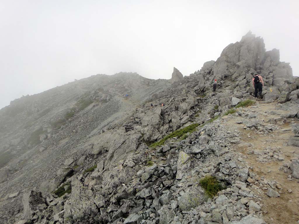途中、右側に剣岳が見えるはずなんですが、どうも雲がかかってしまってきれいに見えません.何枚も写真を撮ったのですが、一番いいのでこの程度です.しかし、振り返って自分の歩いてきた道を見て、疲労困憊している自分の様子から考えれば、剣岳という山がいかに険しいかがよくわかります.あんなところ、本当に人が登れるんだろうかと思えてしまいますが、お盆のピーク時には、山頂に入りきれないくらいの人が登るっていうんですから、凄い人はたくさんいるもんですね.
