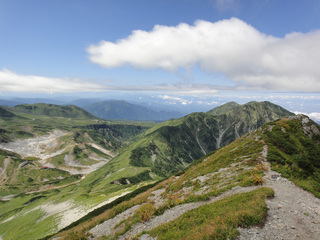 振り返って大日岳方面.歩いてきた尾根筋です.左端に雷鳥荘や地獄谷が見えます.こちらも視界は良好で、どこまで見えているのかと思うほど遠くの山脈が見えました.
