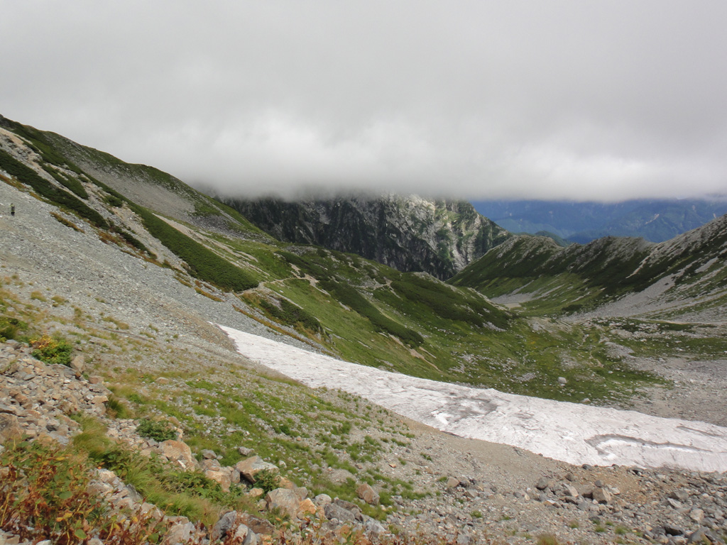 昼食を終えてすぐに出発.「カール」と呼ばれる氷河が削ったUの字型の谷です.夏には大きな雪渓になっていたのですが、今はほとんど溶けてしまっています.そして視線から上は雲です.