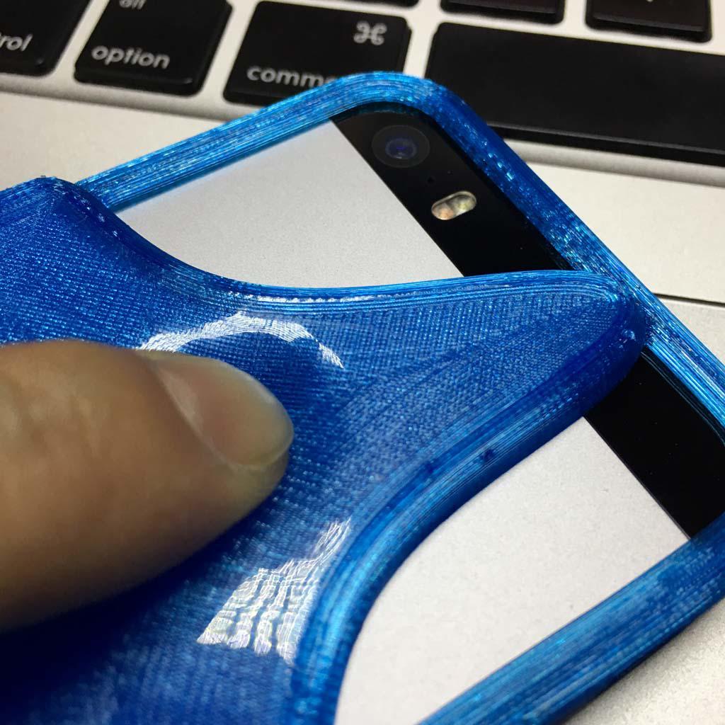 実はこれは2号機でして、1号機は一番見栄えが気になる背面を上向きで印刷したんですけど、スマホケース本体内のサポートをはがすのに非常に苦労をして、本体の一部が引きちぎれたり、表面がサポートにつられてはがれたりと、納得のいくモノではありませんでした.そこで、2号機は背面を下向きにして、ビルドプレートから0.5mmほど浮かせて印刷しました.そうしたら今度は、サポートが本体にくっついてしまってはがせなくなりました.